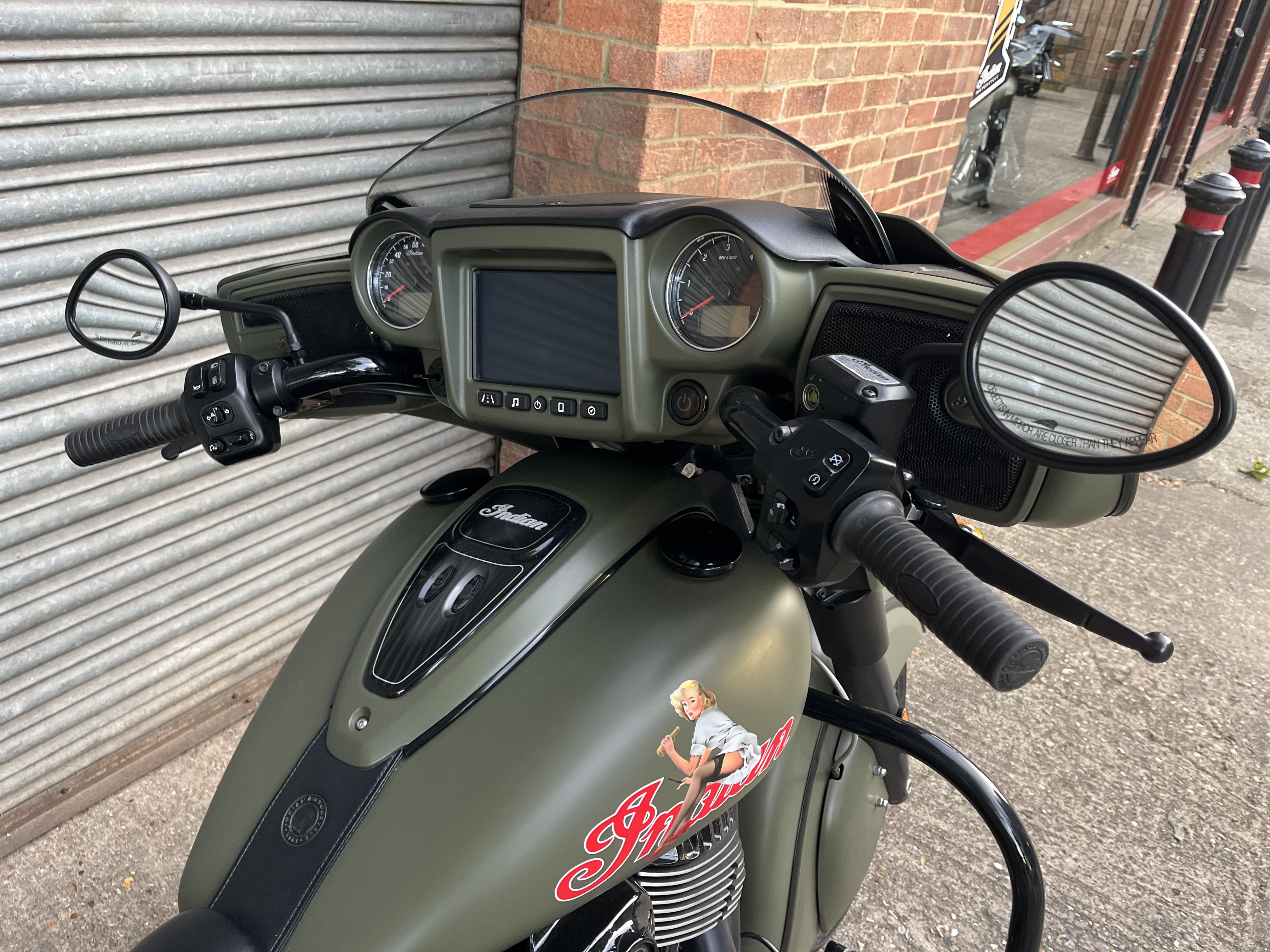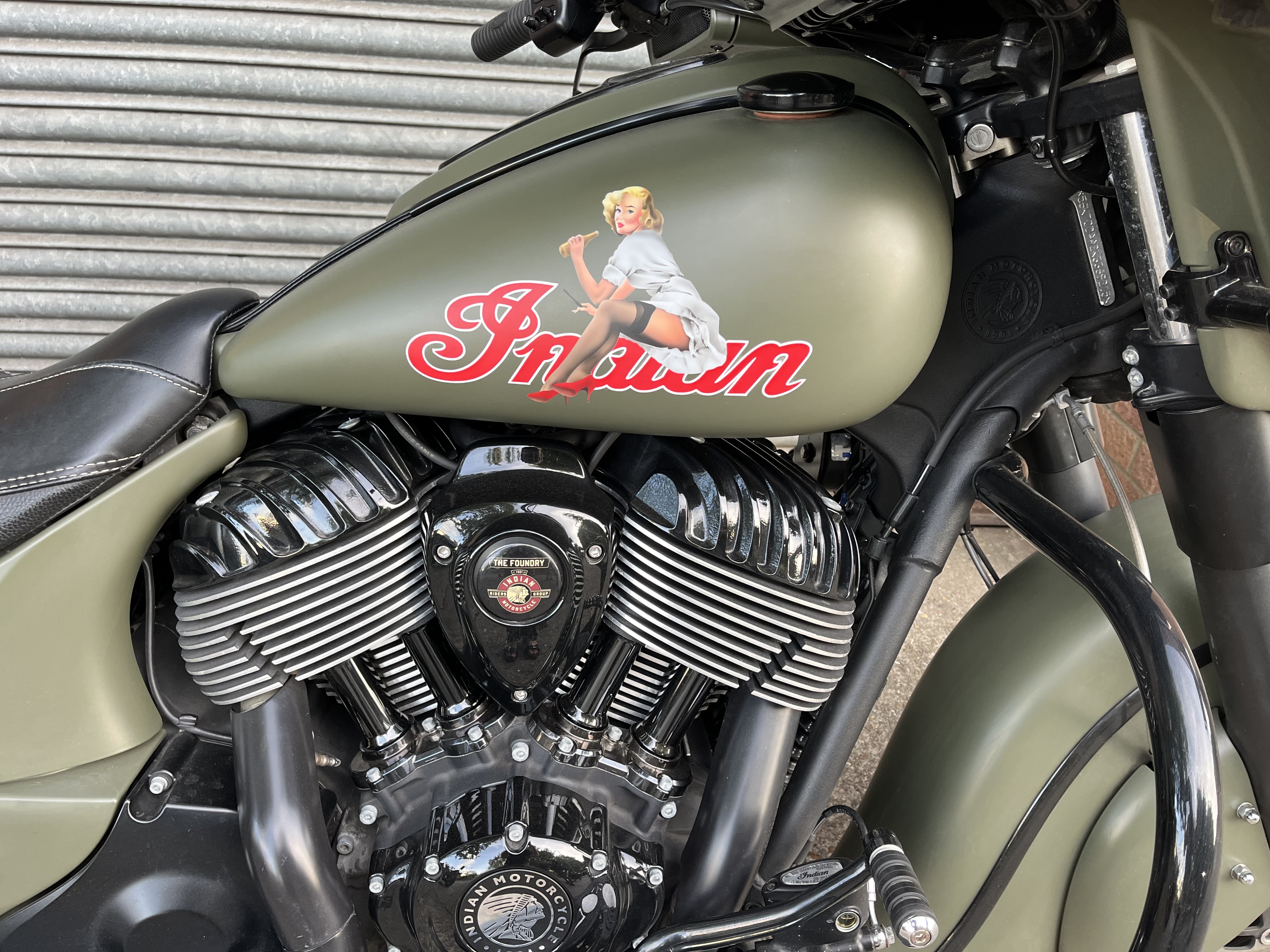 A rare opportunity to own a one-of-a-kind 2019 Indian Chieftain Dark Horse, fully customized in a striking army green finish with 1950s-style pin-up artwork on the tank. This bike pays tribute to classic military styling with a bold and timeless look that turns heads wherever it goes.