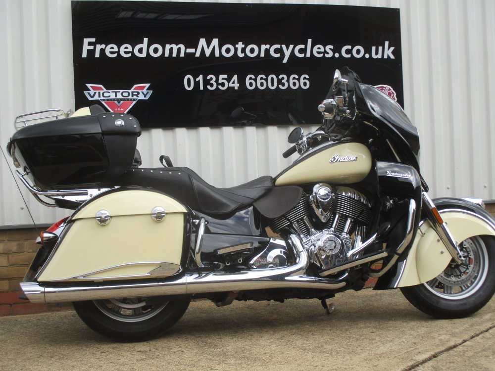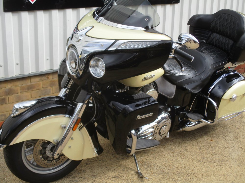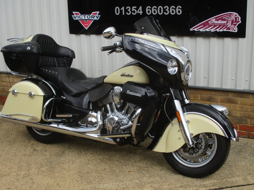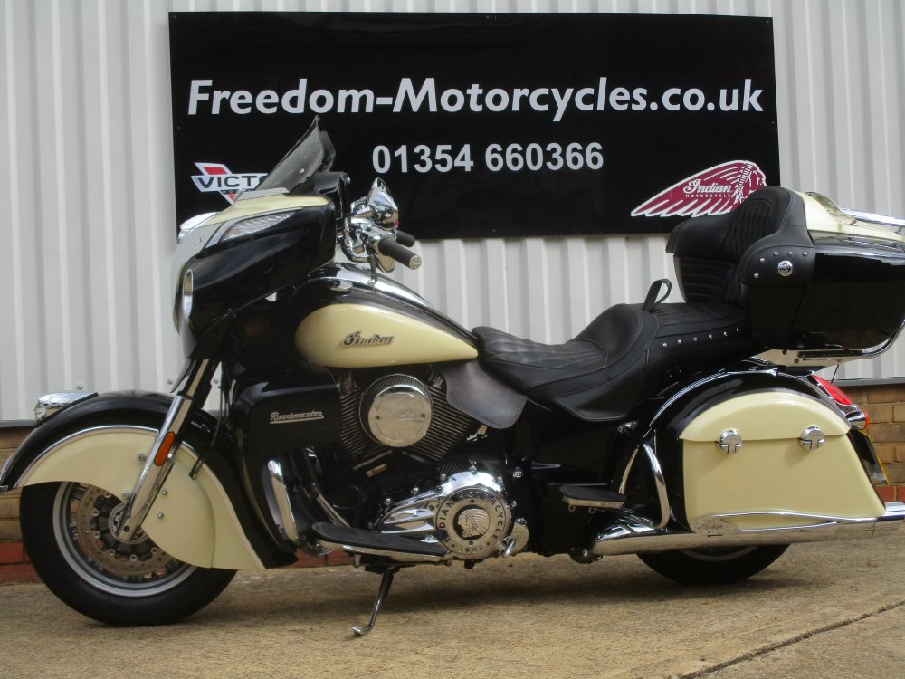 Indian Roadmaster 2016 previously supplied by our store from new and has only had one former keeper.. The machine has only covered 11875 miles from new and comes with all original paperwork and keys. Finished in the two tone gloss Black & Cream the bike is a real head turner, ready to soak up the mile with the effortless 1811cc engine.There is a host of features fitted to the top of the range tourer : cruise control, heated grips Tpms, heated seats front a rear, radio, keyless ignition, remote locking, driving lamps. This two owner machine is also fitted with a huge list of Indain extra's : stage one exhaust, Indian air Intake, Saddlebag protectors, LED Headlight, Kuryakyn Engine dress kit, High level top bow brake light, chrome saddlebag trims, front fairing chrome trim kit, Captain kit cylinder cover, fender extender, Stage two cam shaft's .The extra's on this machine will far exceed £3000.00 The top box will fit two full face helmets comfortably or if you wish to use the bike as a bagger the topbox will clip off with not too much trouble. Please feel free to come and view this stunning machine as the spec needs to be seen to be appreciated.